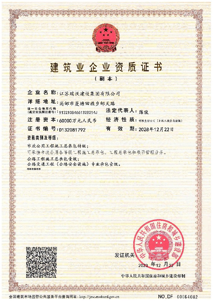 公司现拥有市政公用工程施工总承包特级,工程设计市政行业甲级,公路工程施工总承包一级、建筑工程施工总承包二级等资质。目前公司下设弘瑞、天瑞、金远、盛瑞等全资子公司,拥有江苏欣瑞交通工程检测有限公司,成立了扬州、南京、上海、北京、深圳、贵州、重庆、云南、青海、西藏、内蒙、大庆、宁夏、湖南、海外等分公司。公司按照现代企业管理模式,实行董事会负责制,下设董事会、监事会、董事长室、总经理室、副总经理室、总工室、综合管理部、财务核算中心、市场发展部、工程管理部等部门。