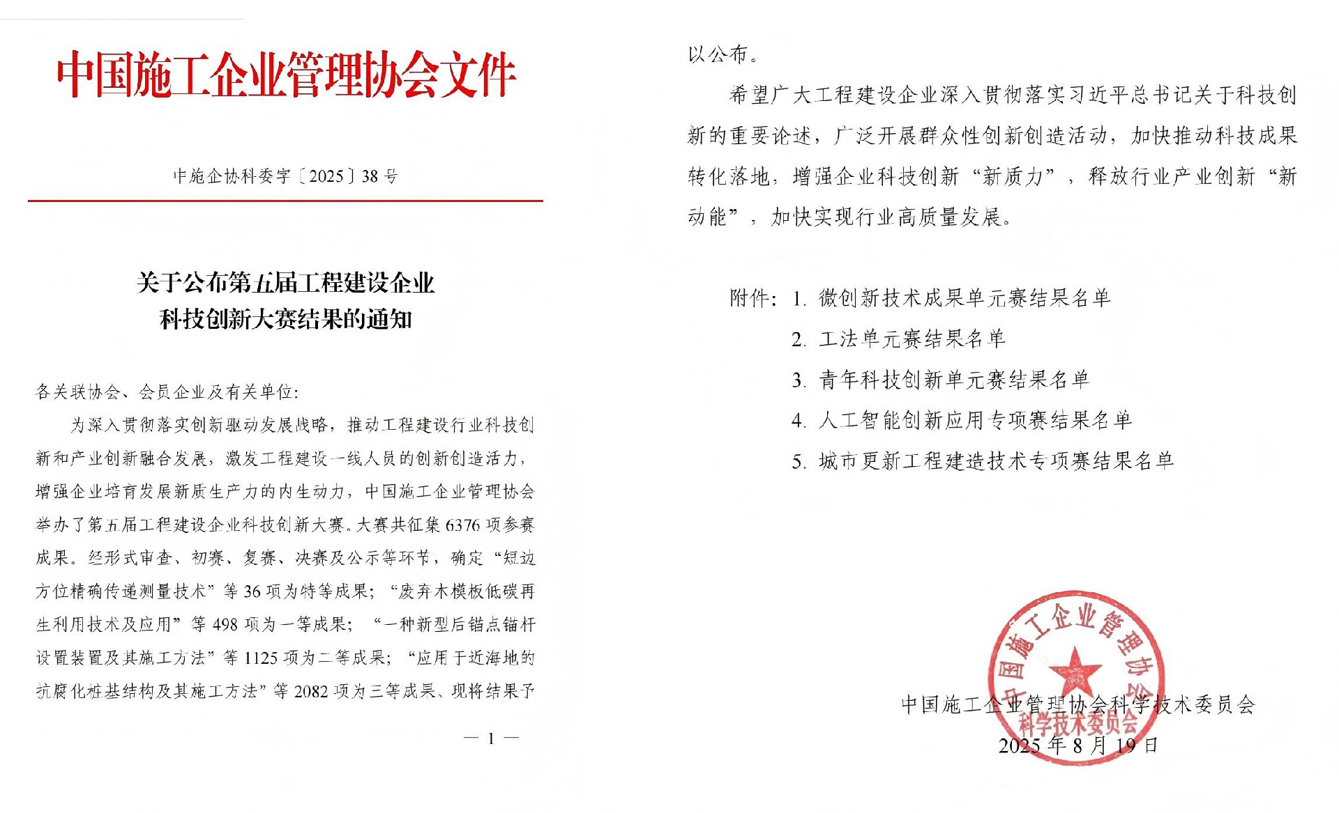 近日,第五届全国工程建设企业科技创新大赛获奖结果出炉,集团在“青年科技创新单元赛”中斩获一···